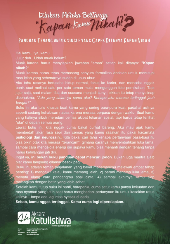 Buku ini aku tulis khusus buat kamu yang sering pura-pura kuat, padahal aslinya seperti sedang kehabisan napas karena merasa berpacu dengan waktu. Buat kamu yang hatinya sibuk meredam cemas akibat tekanan sosial, tapi harus tetap terlihat “oke” di depan semua orang.