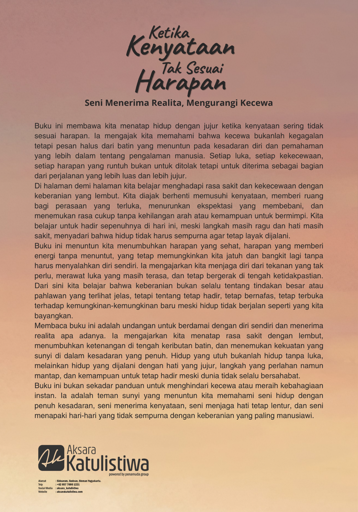 Buku ini membawa kita menatap hidup dengan jujur ketika kenyataan sering tidak sesuai harapan. Ia mengajak kita memahami bahwa kecewa bukanlah kegagalan tetapi pesan halus dari batin yang menuntun pada kesadaran diri dan pemahaman yang lebih dalam tentang pengalaman manusia. Setiap luka, setiap kekecewaan, setiap harapan yang runtuh bukan untuk ditolak tetapi untuk diterima sebagai bagian dari perjalanan yang lebih luas dan lebih jujur.