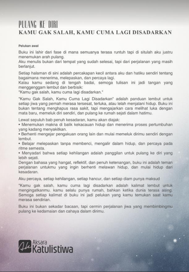 “Kamu Gak Salah, Kamu Cuma Lagi Disadarkan” adalah panduan lembut untuk setiap jiwa yang pernah merasa tersesat, terluka, atau lelah menjalani hidup. Buku ini bukan tentang menghapus rasa sakit, tapi mengajarkan cara melihat luka dengan mata baru, memeluk diri sendiri, dan pulang ke rumah sejati dalam hatimu.
